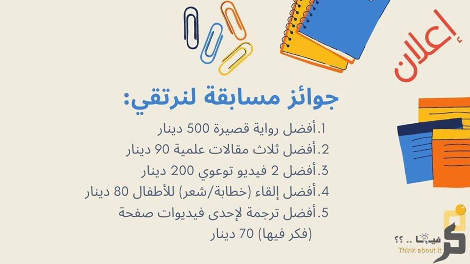 مسابقة لنرتقي الفكرية رواية قصيرة مقال تاريخي اجتماعي اقتصادي فلسفي فيديو توعوي أدب برس أدب ثقافة فن مسابقات و جوائز